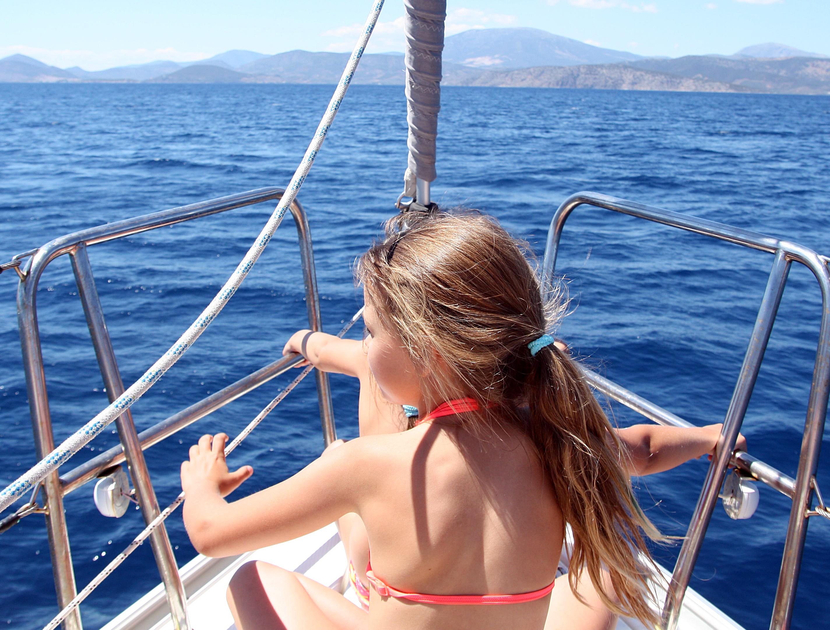 No właśnie, co one właściwie robią? Pytanie to pojawia się zadziwiająco często. Prawda jest taka, że nie mam pojęcia co robią, bo nigdy się nad tym nie zastanawiałam. Na pewno się nie nudzą. Ale gdy zamknę oczy i wrócę do dni na jachcie to widzę, że podczas żeglowania gramy w karty, w statki, w planszówki. Dziewczyny rysują, prowadząc swego rodzaju pamiętnik z podróży, czasem się kłócą, czasem oglądają coś na komputerze, czasem wylegują się niczym foki chłonąc grecką atmosferę, czasem siedzą na dziobie i gapią się na to co przed nami. Nie robimy nic konkretnego. Spędzamy razem czas. Podczas jednego z naszych pierwszych rejsów z dziećmi zauważyłam, że żeglowanie z dziećmi to takie rodzinne perpetuum mobile. Rodzice są szczęśliwi bo są na morzu ze szczęśliwymi dziećmi, dzieci są szczęśliwe bo widzą szczęśliwych rodziców i dlatego że są morzu, a rodzice widząc szczęśliwe dzieci są szczęśliwymi rodzicami na morzu. I tak w kółko. Oczywiście są momenty trudne. Fakt, że jesteśmy w pięknym otoczeniu na jachcie nie sprawia, że naturalne elementy rodzinnego życia znikają jak za sprawą czarodziejskiej różdżki. Ale gdy wejdziemy w tryb wakacyjny i wybierzemy opcję bycia szczęśliwym, to jest łatwiej. Jest dobrze, a nawet można by rzec, jest idealnie.