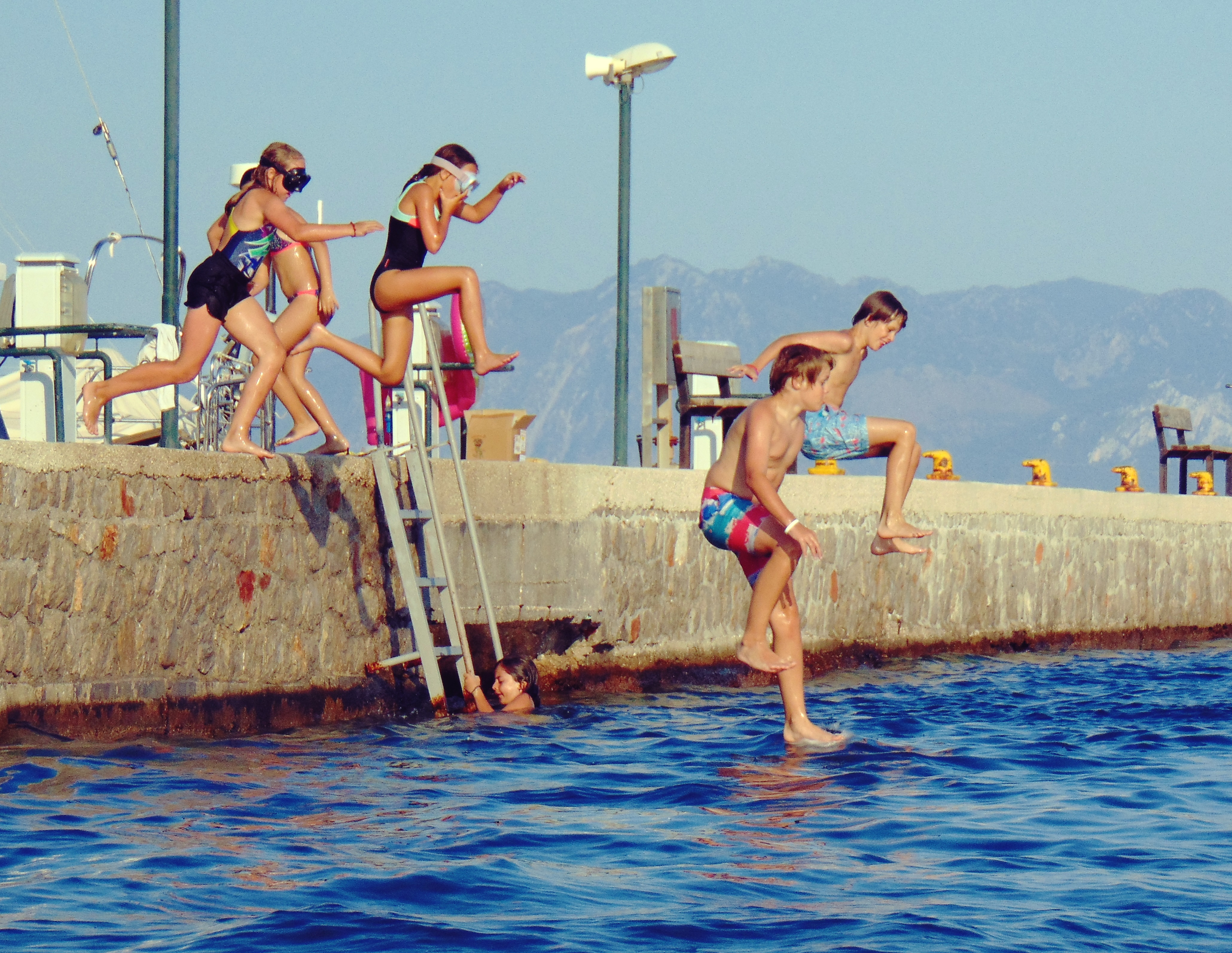 Stoimy jachtem na kotwicy, kilkaset metrów od brzegu. Fale są większe niż zazwyczaj. Dzieci skaczą do wody z rufy jachtu. Po przepłynięciu krótkiego odcinka wychodzę z wody i bez zastanowienia mówię do córek, żeby już nie skakały.