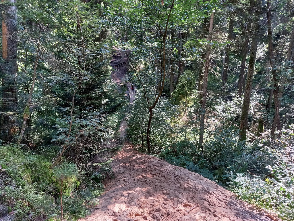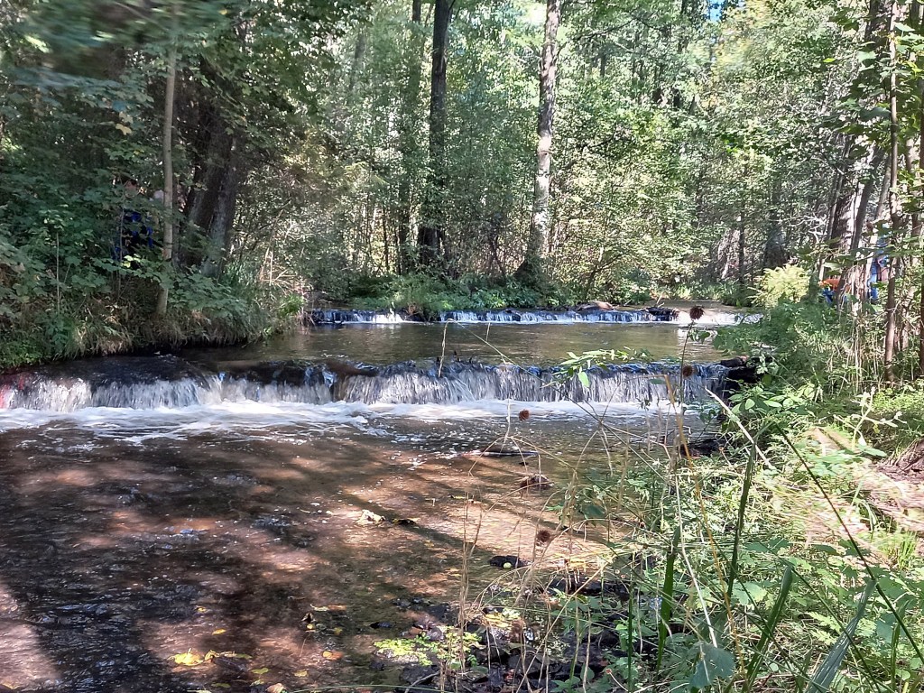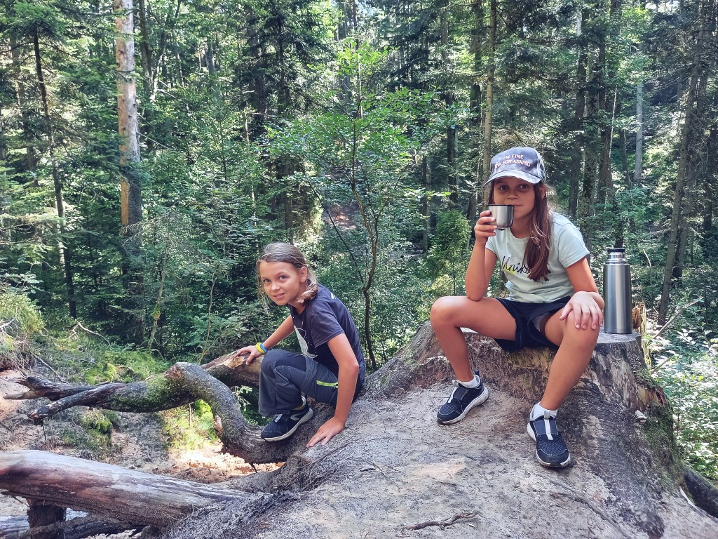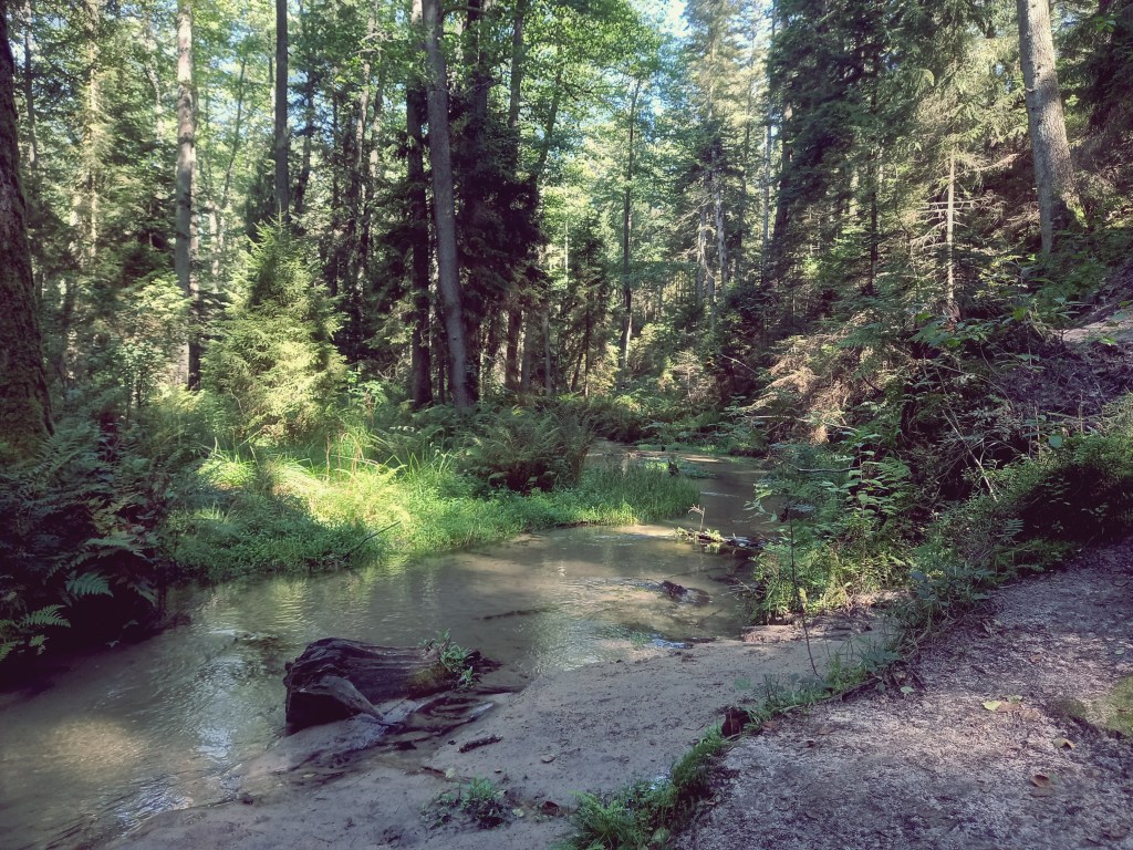 Przy wodospadzie, który ma 1,5 m wysokości i ponad 9 m szerokości, zdecydowaliśmy, że idziemy dłuższą trasą. Zmieniliśmy szlak z żółtego na niebieski i ruszyliśmy do miejsca o nazwie Kościółek. Po drodze była herbata z termosu, która jest obowiązkowym punktem naszych wypraw i wspinaczka na piaszczystą skarpę, po to by później zejść nią w stronę rzeki. Z każdym krokiem chłonęliśmy miejsce, w którym się znaleźliśmy, czując ogromną wdzięczność, że możemy tu być.